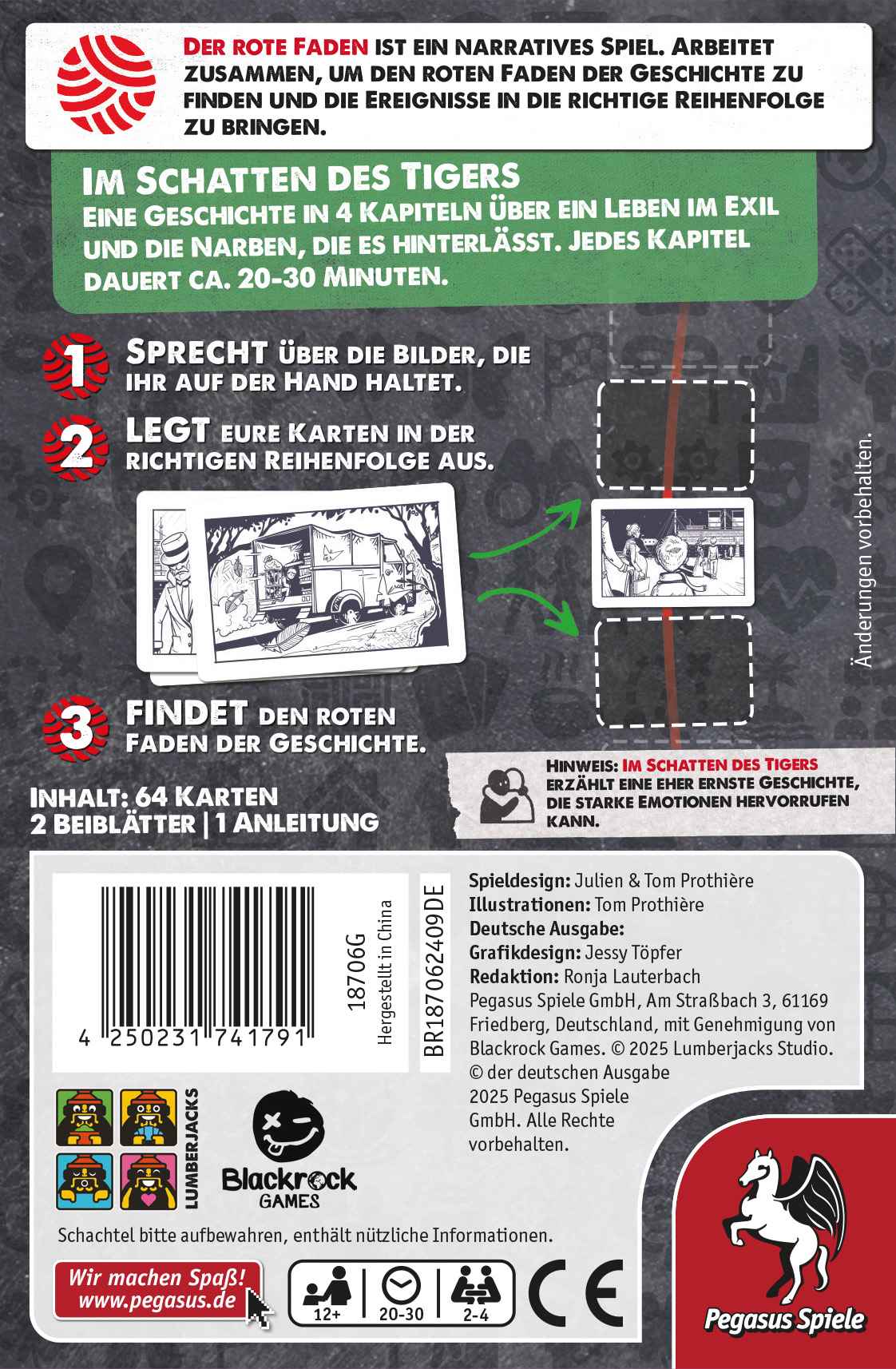 Der Rote Faden – Im Schatten des Tigers ist ein kommunikatives Deduktionsspiel mit vier zusammenhängenden Kapiteln, die eine Geschichte über das Leben im Exil erzählen.