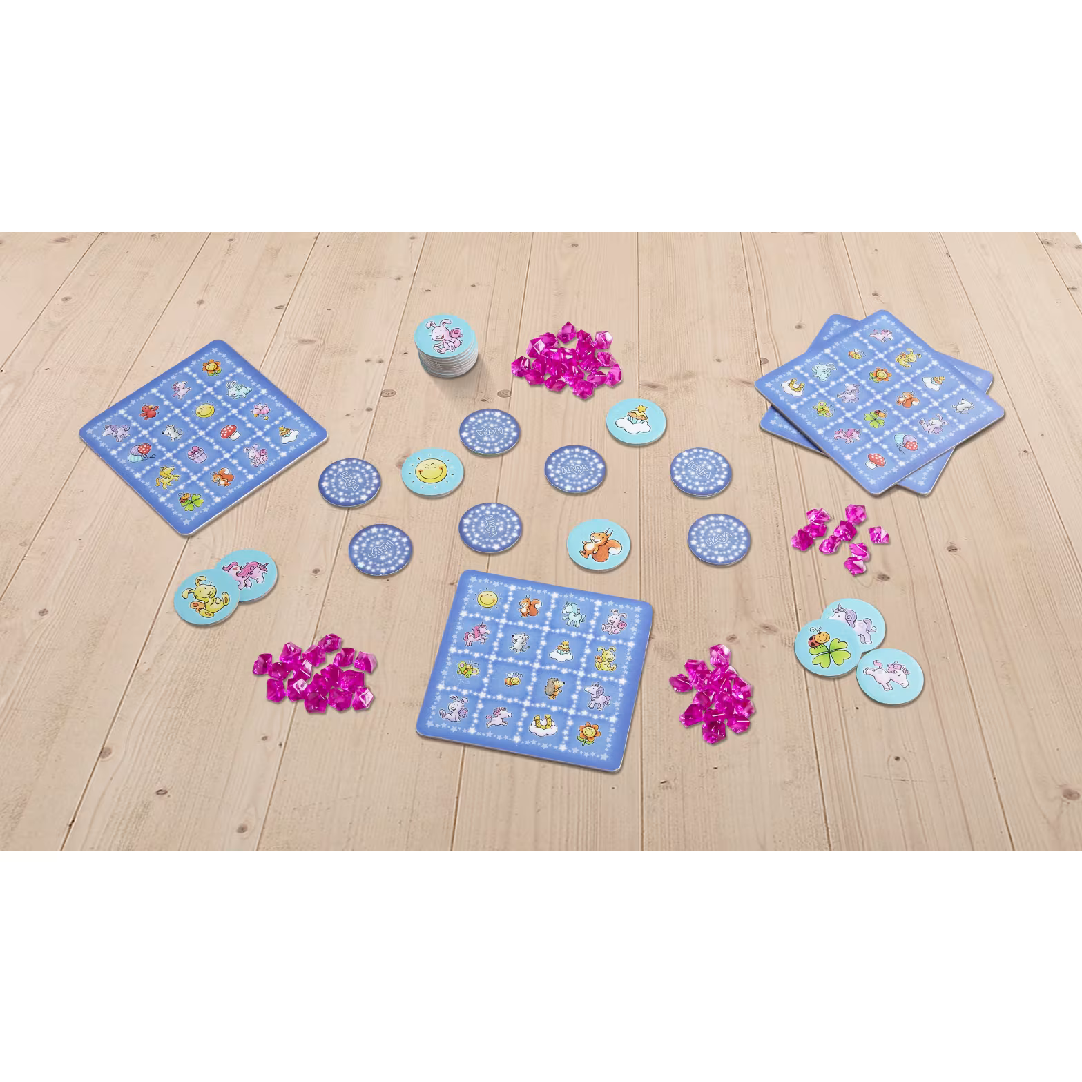 Einhorn Glitzerglück und seine Freunde spielen heute Funkel-Bingo. Wer spielt mit und schaut, ob die Bilder der aufgedeckten Plättchen auch auf dem eigenen Bingo-Plan zu sehen sind? Hier ein lustiger Käfer, da ein kleiner Igel! Für jedes passende Bild darf man einen Wolkenkristall auf seinen Plan legen. Wer zuerst vier Kristalle in einer Reihe hat, gewinnt.