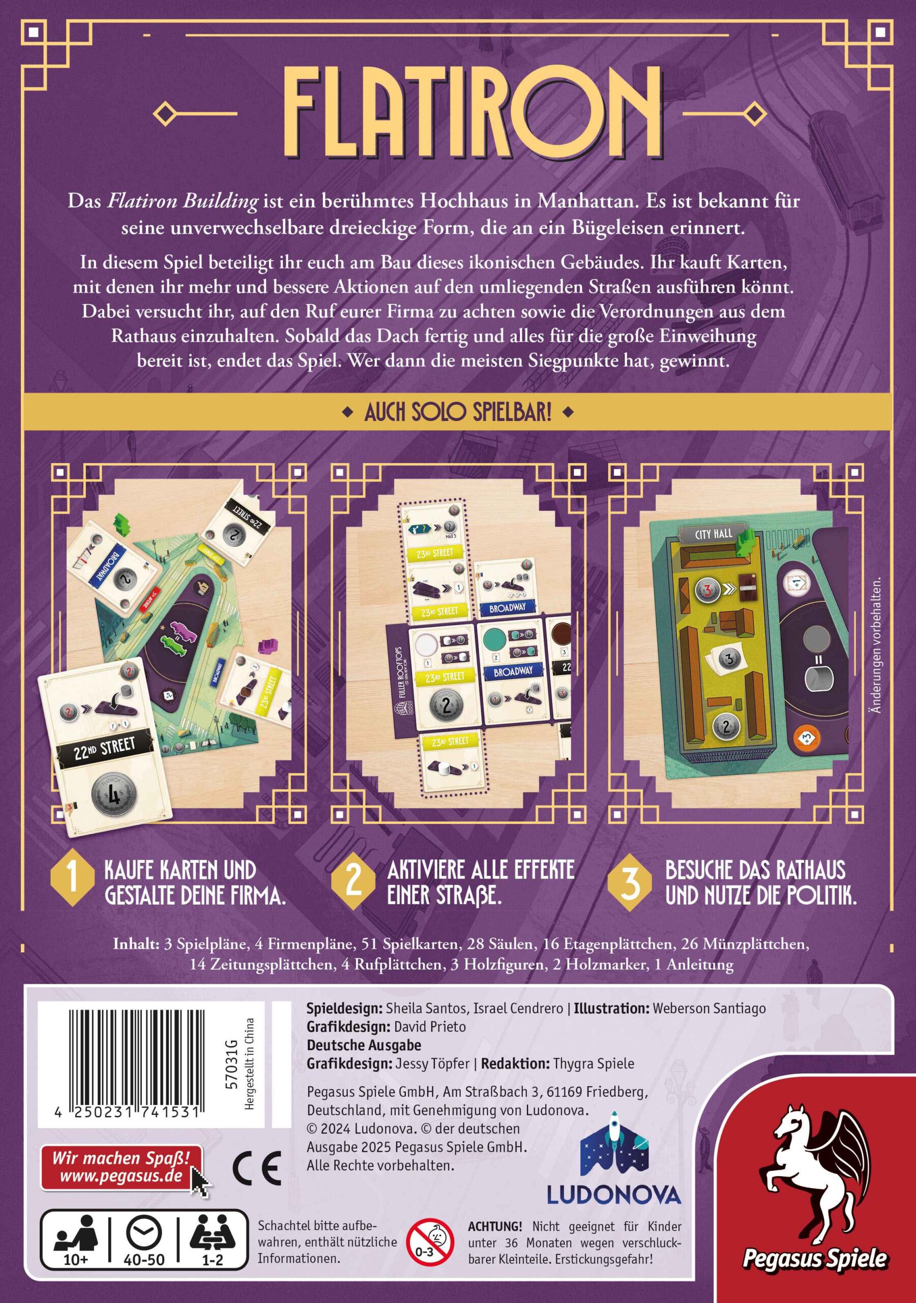 In Flatiron beteiligen sich die beiden Spielenden am Bau dieses ikonischen Gebäudes. Sie kaufen Karten, mit denen sie mehr oder bessere Aktionen auf den umliegenden Straßen ausführen können. Dabei versuchen sie, auf den Ruf ihrer Firma zu achten sowie die Verordnungen aus dem Rathaus einzuhalten. Sobald das Dach fertig und alles für die große Einweihung bereit ist, endet das Spiel. Wer dann die meisten Siegpunkte hat, gewinnt.