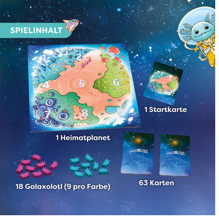 63 Karten, 18 Galaxolotl (9 pro Farbe), 1 Heimatplanet, 1 Startkarte.