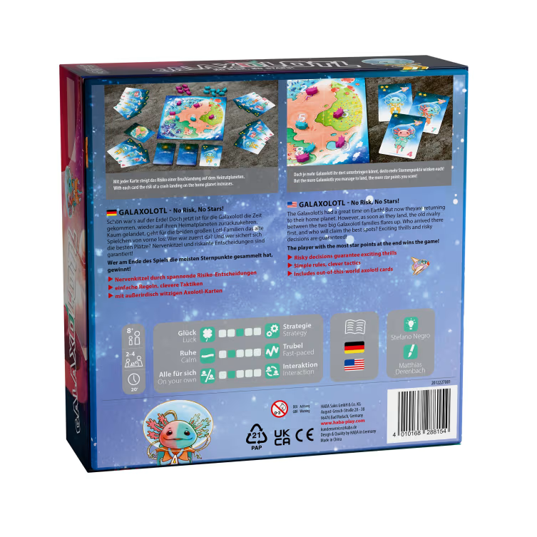 Schön war’s auf der Erde! Doch nun kehren die Galaxolotl auf ihren Heimatplaneten zurück. Kaum gelandet, entbrennt auch schon wieder der alte Wettstreit zwischen den beiden großen Lotl-Familien: Wer war zuerst da, und wer ergattert die besten Plätze? Nervenkitzel und riskante Entscheidungen sind garantiert! Wer am Ende die meisten Sternpunkte gesammelt hat, gewinnt!