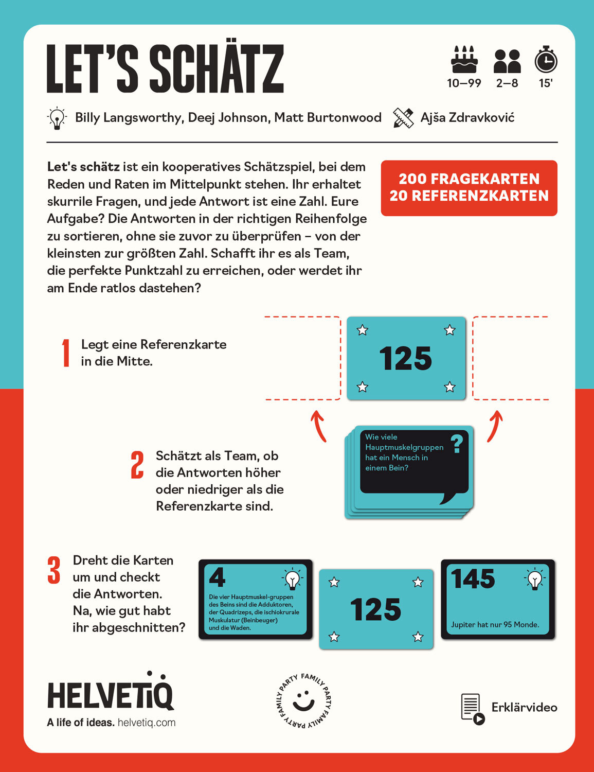 Let‘s Schätz ist ein unglaublich witziges Kommunikationsspiel, bei dem Reden und Raten im Mittelpunkt stehen. Ihr bekommt skurrile Fragen, deren Antwort immer eine Zahl ist. Eure Aufgabe: Bringt die Antworten in die richtige Reihenfolge – von klein nach groß. Schafft ihr es, als Team die perfekte Punktzahl zu erreichen, oder bleibt ihr am Ende ratlos zurück?