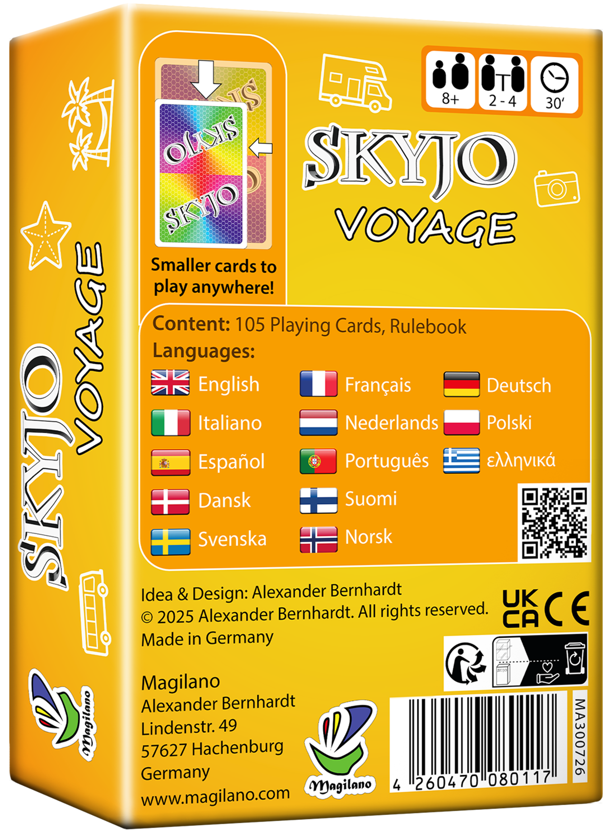Nimm den Spaß von Skyjo überallhin mit – mit Skyjo Voyage, der kompakten, reisefreundlichen Version des beliebten Kartenspiels für Familien und Freunde! Mit kleineren Karten und einer schlanken, tragbaren Box ist diese Edition perfekt für Urlaube, Roadtrips, Flüge oder gemütliche Spieleabende unterwegs.