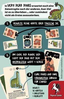 In Very Dead Dinos werden die Spielenden zu Dinos. Ihr Ziel: in einer Welt voller Desaster möglichst lange überleben. Die jeweiligen Desaster-Karten mit Werten von 1-11 stellen die Dinos vor bestimmte Herausforderungen, auf die sie unterschiedlich gut vorbereitet sind. Daher hat jede*r die Möglichkeit, die eigene, zufällig zugeteilte Desaster-Karte zu tauschen – entweder mit der aufgedeckten Karte im Fluss oder mit dem Dino zur Linken. Anschließend decken alle gleichzeitig ihre Desaster-Karten auf und die Karten werden verglichen: Die Person mit dem niedrigsten Wert verliert ein Leben. Effekte auf Dino- und Desaster-Karten können dies aber manipulieren und vielleicht sogar einen anderen Dino ins Verderben stürzen … Sobald eine Person drei Leben verloren hat, endet die Partie: Die anderen Dinos überleben und dürfen sich über ihren Sieg freuen!