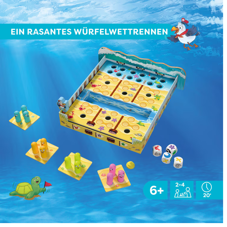 Ach Watt! Heute ist Action am Strand, denn gleich startet die große Watt-Rallye! Nur mit den richtigen Würfelergebnissen können die eigenen Wattwurm-Teams über die Rennstrecke flitzen, um schnellstmöglich das Riff zu erreichen. Doch Achtung: Die Welle spült alle zurück, die sich nicht rechtzeitig in den Sandlöchern verstecken! Wer seine Wattwürmer mit Taktik und etwas Würfelglück zuerst ins Ziel bringt, gewinnt die Rallye.